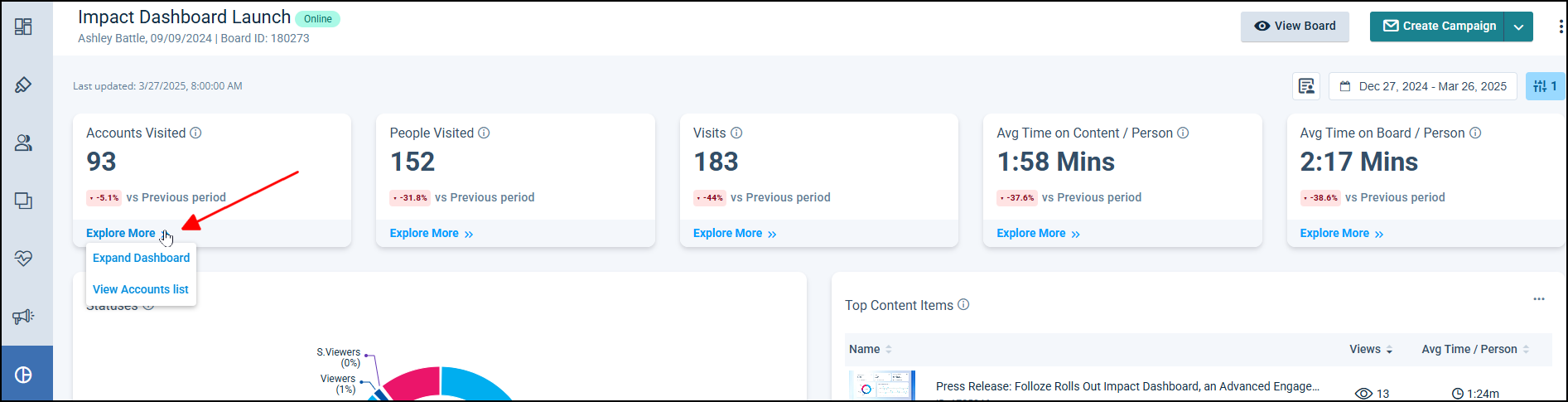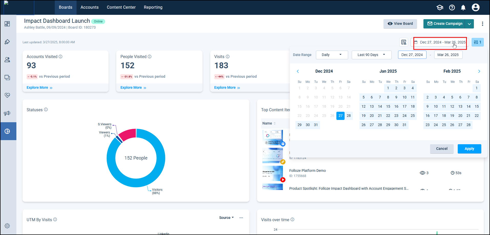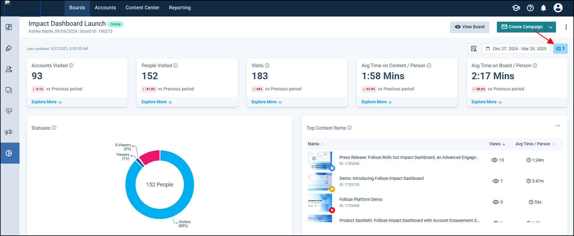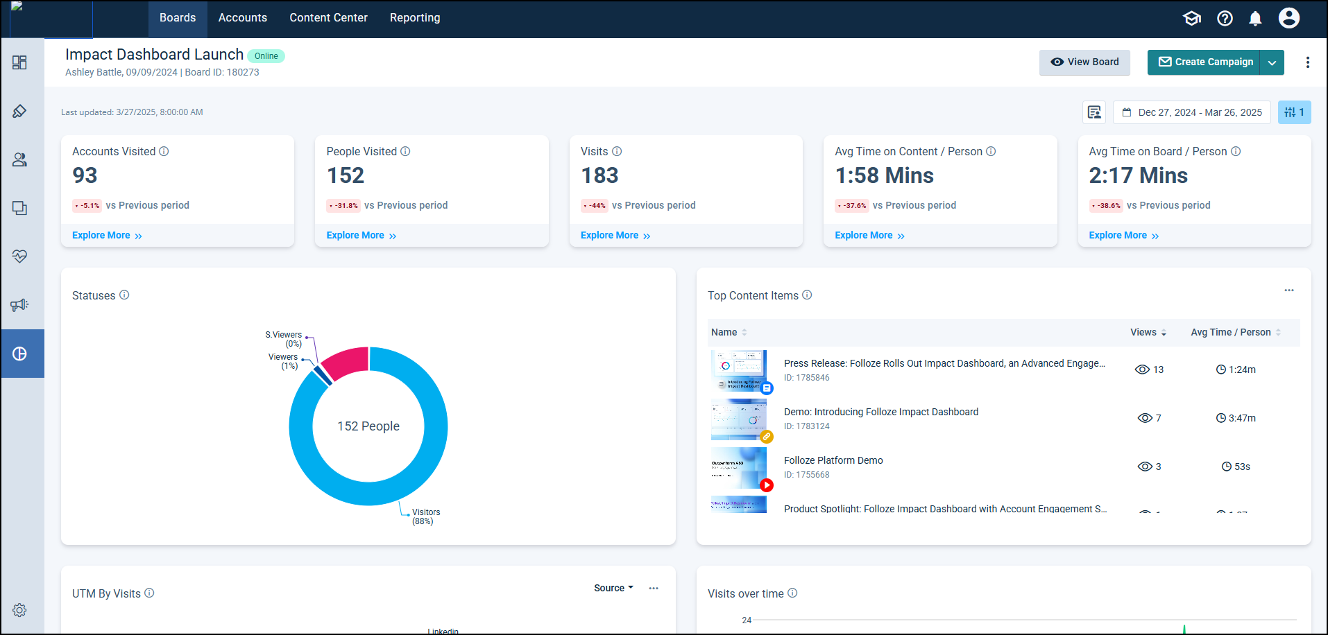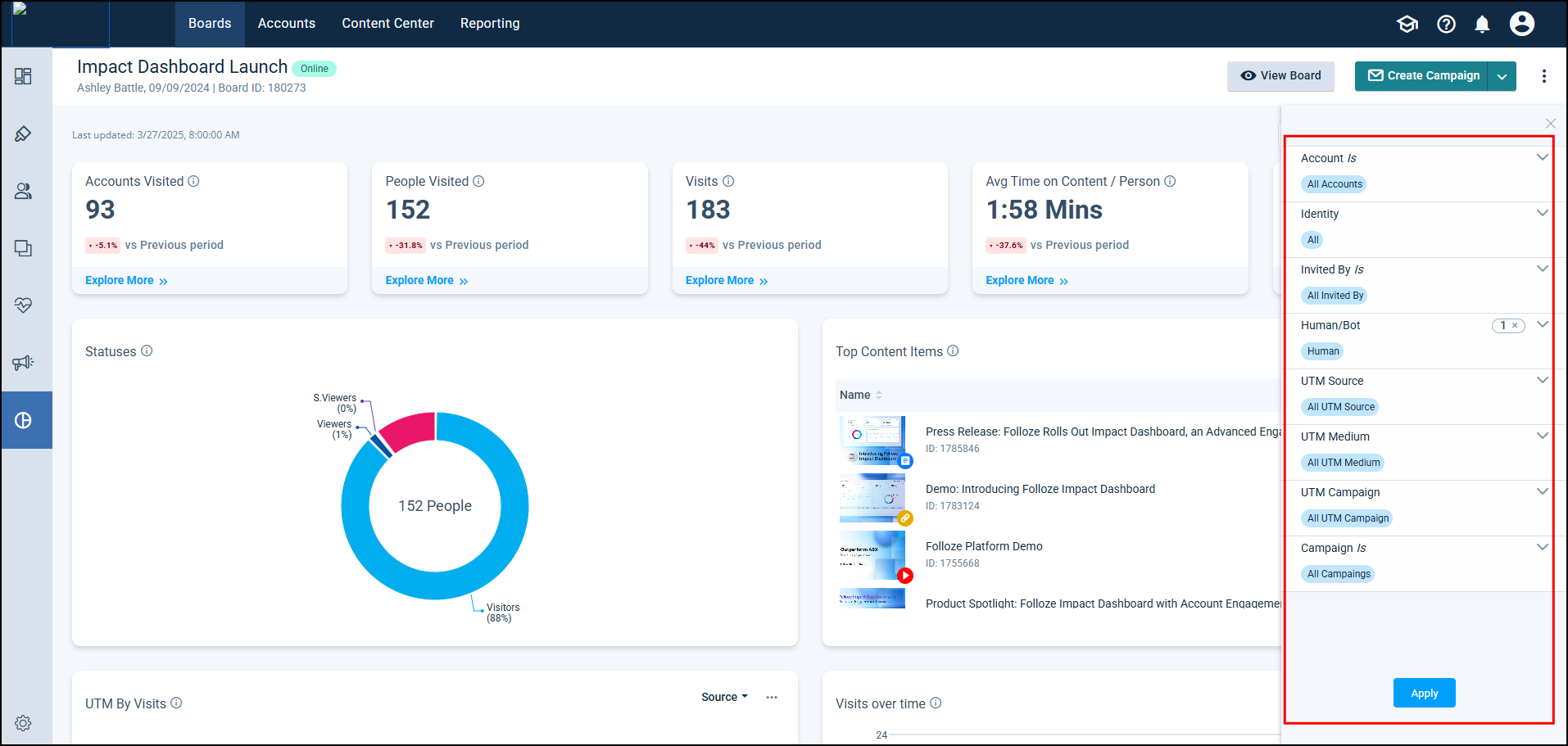 Impact Dashboard FAQs 275Number of Views Organization-level Impact Dashboard 697Number of Views Analytics Dashboard - My Dashboard 502Number of Views Folloze + Salesforce - Account Dashboard Widget 368Number of Views Connecting HubSpot Forms to Folloze 298Number of Views