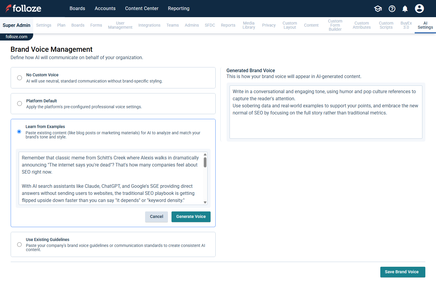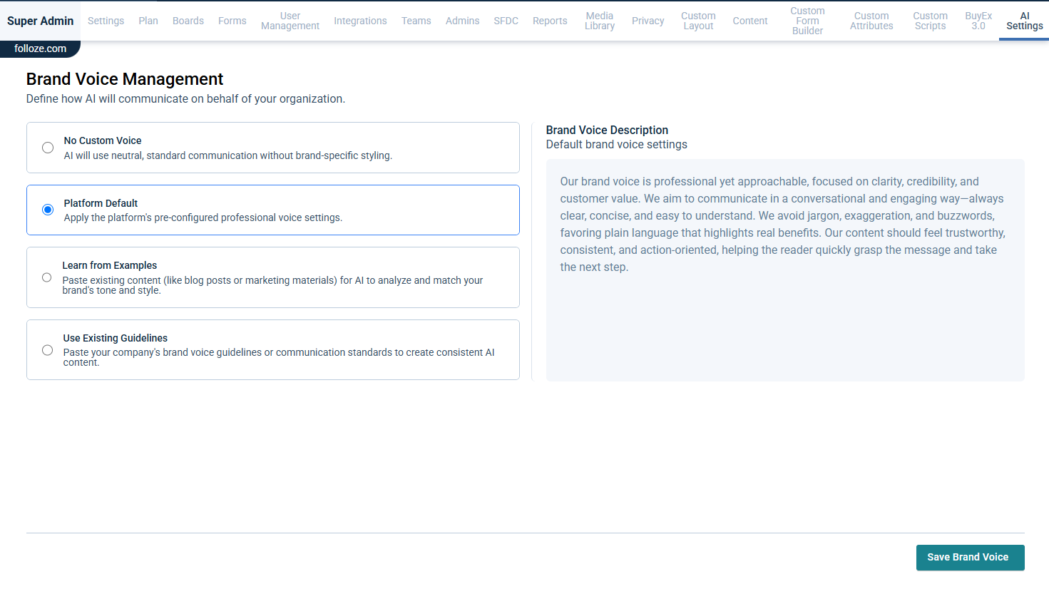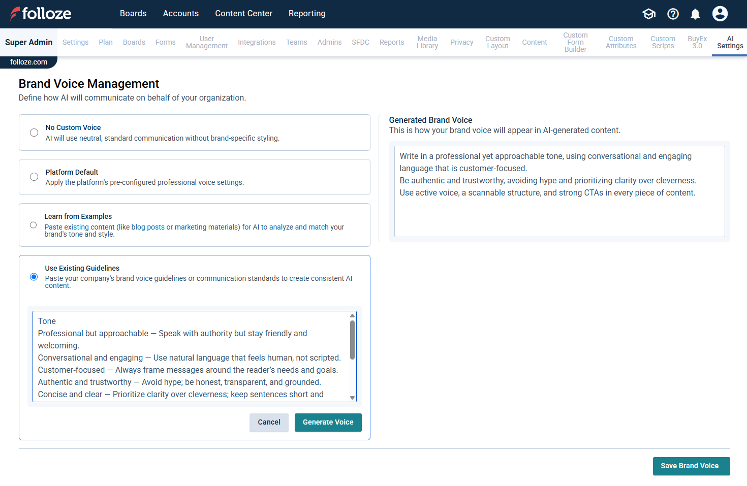 Temporary SectionArticle BodyThe Brand Voice Management feature allows administrators to control the tone and style of all AI-generated text content across your boards. This ensures consistency in communication and helps maintain your organization's unique identity throughout all AI-assisted content creation. Benefits of Using Brand Voice Maintain consistent messaging across all boardsEnsure AI-generated content aligns with your company's communication styleCreate a cohesive experience for your audience Setting Up Brand Voice As an administrator, you can select how brand voice should be applied for your organization through the Brand Voice Management screen. You have four options for configuring Brand Voice. Option 1: No Brand Voice This option means AI-generated text will be delivered exactly as produced by the AI system with no style modifications. Select the No Custom Voice option. Click Save Brand Voice at the bottom of the screen. Messages will not use any specific brand voice styling. With this setting, you'll receive unmodified output directly from the AI language model without any tone or style adjustments. Option 2: Use System Default This option is best for organizations that don't have established brand guidelines or prefer a professional, balanced tone. Select the Platform Default option. Click Save Brand Voice at the bottom of the screen. This option uses the platform's default brand voice settings, which are designed to be professional, clear, and engaging while remaining versatile enough for most business contexts. Option 3: Generate from Sample Text For organizations with specific examples of their preferred communication style: Select the Learn from Examples option. In the text box that appears, paste sample content that represents your brand's voice and tone. Choose content that clearly demonstrates your preferred tone, style, and vocabulary.Include enough text (300-500 words is suggested) to capture the nuances of your brand voice.Use actual marketing materials, website copy, or other content that exemplifies your brand communication. Click Generate Voice.Review the generated Brand Voice in the right panel.Click Save Brand Voice at the bottom of the screen to apply this voice to all AI-generated content. Option 4: Generate from Guidelines For organizations with established brand voice guidelines: Select the Use Existing Guidelines option. In the text box that appears, paste your company's voice guidelines to create a brand voice. Include key descriptors of your tone (e.g., "conversational but professional").Add any specific terminology preferences or phrases to emphasize/avoid.Mention target audience considerations if relevant. Click Generate Voice button.Review the generated Brand Voice in the right panel.Click Save Brand Voice at the bottom of the screen to apply this voice to all AI-generated content. Managing Brand Voice Generated Brand Voice After generating a brand voice using either sample text or guidelines, you'll see the Generated Brand Voice section in the right panel. If necessary, you can click Regenerate if needed to create a new version. Note: Only one Brand Voice can be active at a time across your organization. Changing Your Brand Voice If you want to replace your current Brand Voice with a new one: Select any of the four available options: No Brand VoiceUse System DefaultGenerate from Sample TextGenerate from Guidelines If you select one of the generation options, enter the required content and click Generate Voice.Click Save Brand Voice at the bottom of the screen.This new selection will replace your previous Brand Voice configuration. Remember that only one Brand Voice setting can be active at a time across your organization. Best Practices Be specific: The more detailed your sample text or guidelines, the more accurately the AI will capture your brand voice.Use authentic examples: Select sample text that truly represents your desired communication style.Consider your audience: Ensure your Brand Voice aligns with the expectations of your target audience.Review regularly: Periodically assess if your Brand Voice still matches your organization's evolving identity. Impact on Board Creation Once configured, your selected Brand Voice will automatically apply to all AI-generated text across boards. Brand Voice does not affect personalized content or translations.Individual board creators will not need to take any additional steps - the Brand Voice will be applied seamlessly in the background to maintain consistent messaging across your organization.Article Created Date5/21/2025 5:17 PMTitleBrand Voice for Generation AgentURL NameBrand-Voice-for-Generation-agentZendesk Article IDSummaryHelp Summary