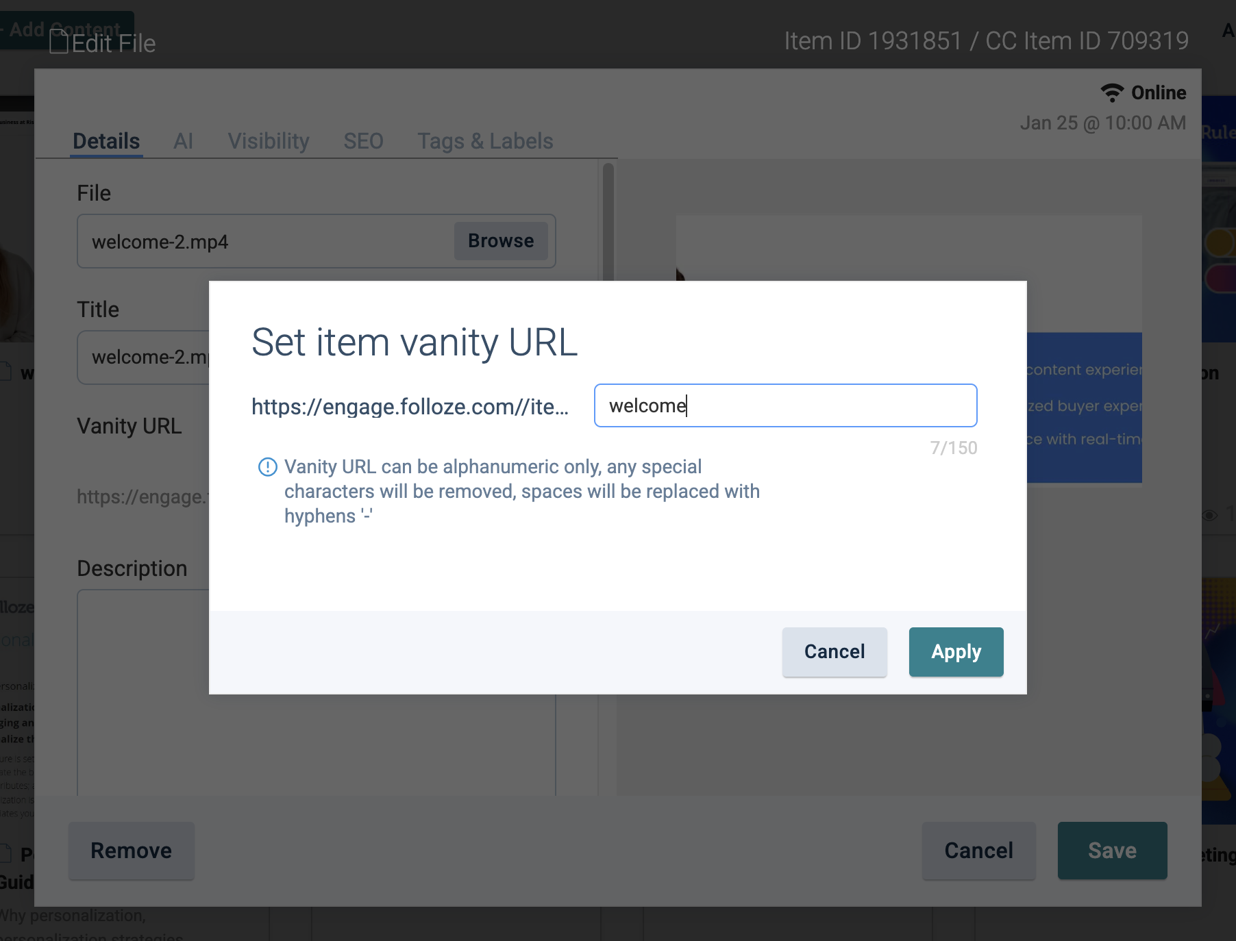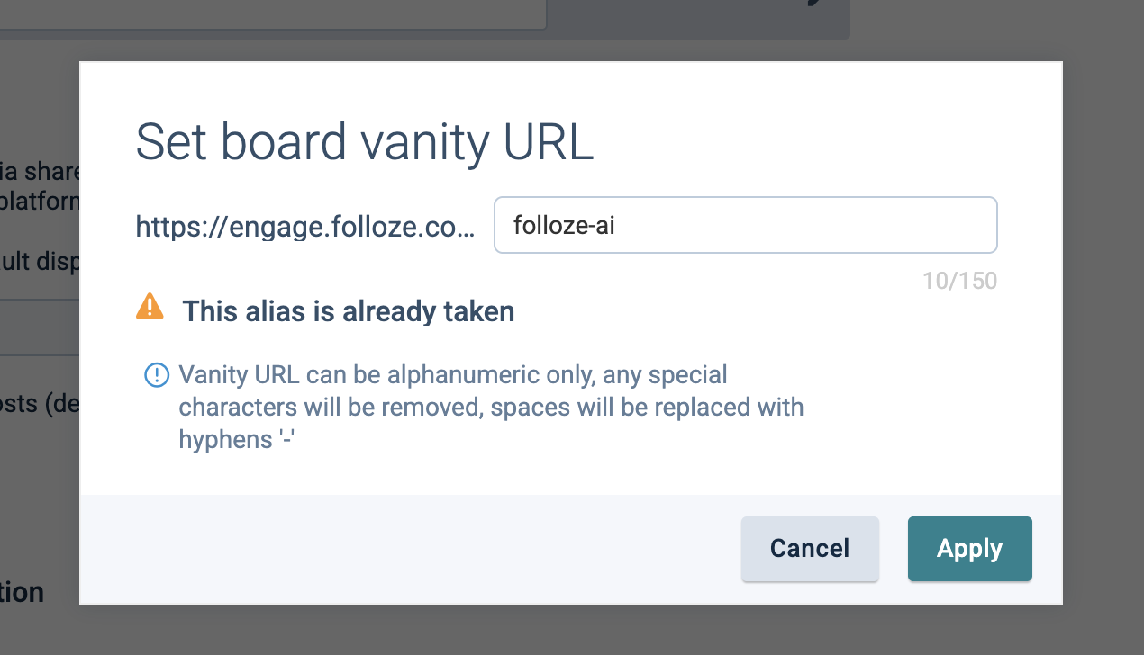 Creating a Vanity URL for Content Items 2.62KNumber of Views Creating a Vanity URL for Boards 641Number of Views Adding a Web Link (URL) to a Board 439Number of Views Managing Company Board Templates BuyEx3.0 1.27KNumber of Views Activating Secure HTTPS URLs 382Number of Views